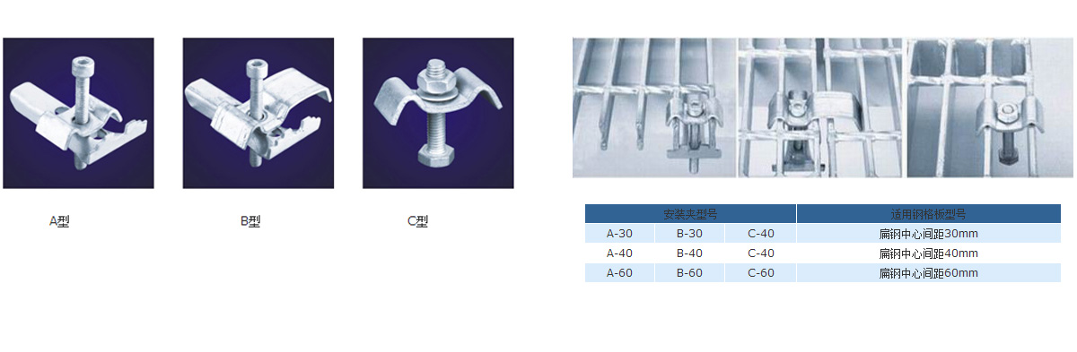 2. B型:由一塊帶雙鉤的上壓板(其中一個鉤可將相鄰的兩塊鋼格板連接在一起),一塊帶齒的下壓板和一支M8的內(nèi)六角螺栓組成。